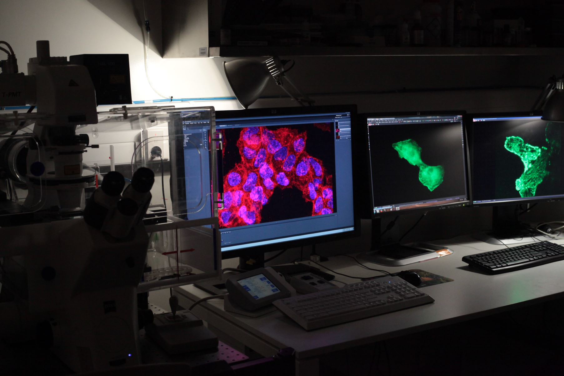 Holotomography microscope (Nanolive, 3D Cell-Explorer) – Used no acquire label-free 3D images of living cells in physiological conditions (close incubation chamber) without any bleaching or phototoxicity, and without the need of stains or fixation. The generated non-invasive holotomographs, obtained using the phase-shift of light in many cross sections to achieve 3D imaging, show with details the cellular structures and allow recording cellular processes in real time, for long periods (up to weeks).