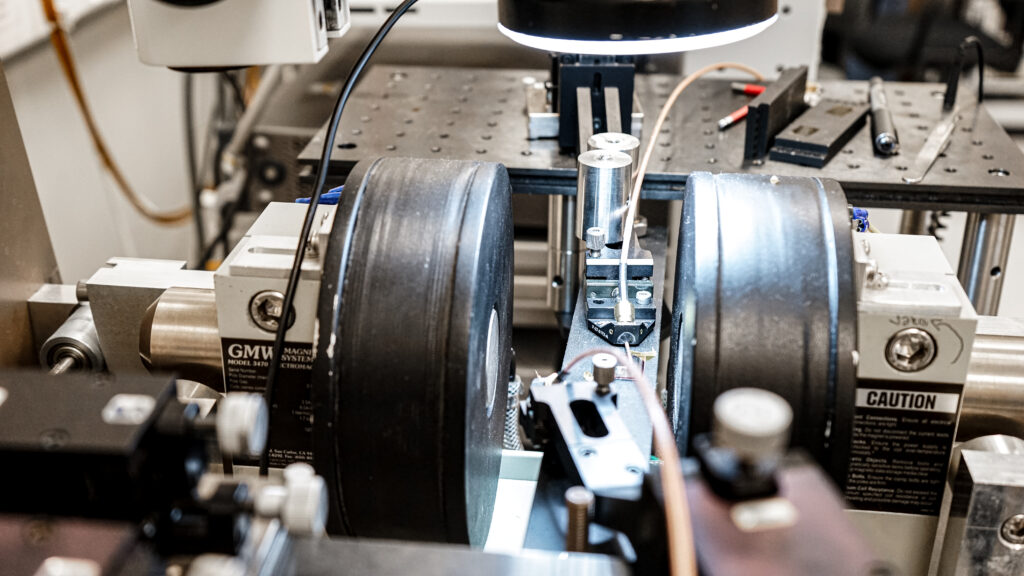 Synchronization and spin diode torque studies can also be performed since an RF signal can be provided to the MTJ and the generated DC voltage measured. The signal is then transported through coaxial cables to a 3 Hz – 44 GHz spectrum analyser where the emission spectrum can be acquired. Power suppliers are used to provide current both to the MTJ and the magnet.