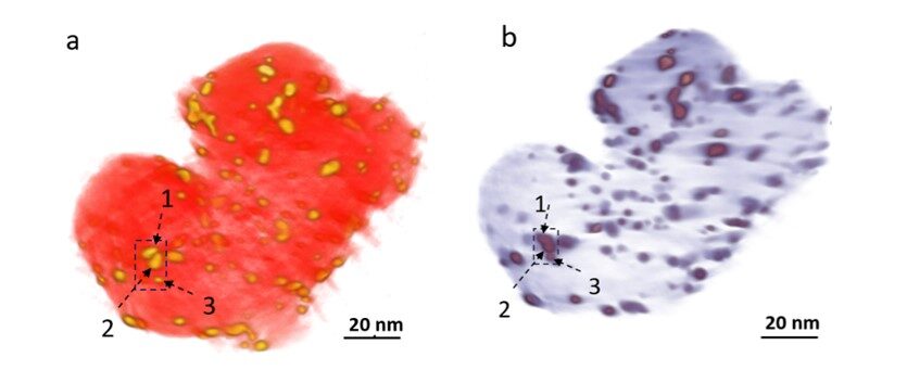 3D visualization of Pt NPs on carbon black at the beginning of life (left) and after 6000 potential cycles (right) - Atomic defects in 2D nanomaterials, in particular semiconductor and semimetal materials for the new generation of electronics and information technologies